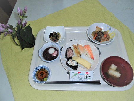 美味しそうなお寿司と、お月見を思わせるお団子をぜんざいに浮かべて